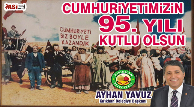 Kırıkhan Belediye Başkanı Ayhan Yavuz, 29 Ekim Cumhuriyet Bayramı ve Cumhuriyetimizin kuruluşunun 95. Yılı münasebetiyle kutlama mesajı yayınladı.