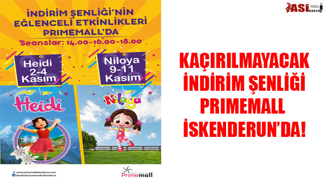 Belirli mağazalarda geçerli olacak “İndirim Şenliği”nde alışverişin yanı sıra, eğlenceli etkinliklere de ev sahipliği yapacak olan Primemall İskenderun, 2-3-4 Kasım tarihlerinde çocukların severek izlediği Heidi’yi ve 9-10-11 Kasım tarihlerinde ise Niloya’yı sevenleriyle buluşturacak. Mağazaların özel indirimlerinden yararlanmak ve eğlenceli etkinliklere dâhil olmak için sizleri Primemall İskenderun’a davet ediyoruz.