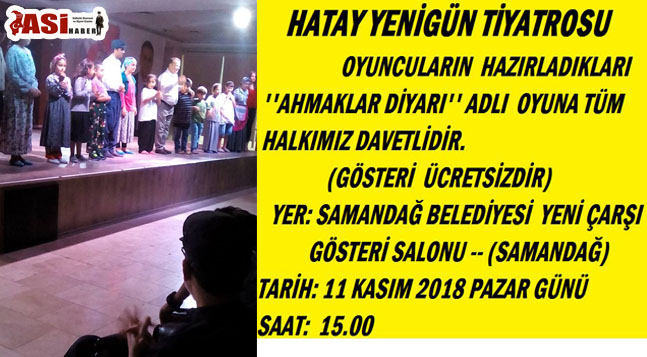 Hatay Yenigün Tiyatro Topluluğu’nun hazırladığı ve Yusuf Recepoğlu’nun yazıp yönettiği “Ahmaklar Diyarı” adlı tiyatro oyununu 11 Kasım 2018 Pazar günü saat 15:00’da Samandağ Belediyesi Yeni Çarşı salonunda gerçekleşecek.