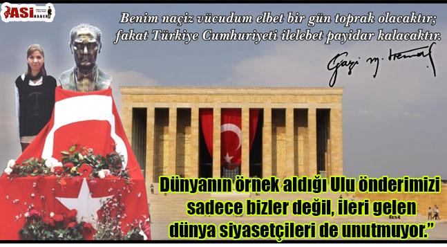 Dünyanın örnek aldığı Ulu önderimizi sadece bizler değil, ileri gelen dünya siyasetçileri de unutmuyor. Bizlerinde görevi Atatürk’ün en büyük eseri olan Cumhuriyeti anlamak, Cumhuriyetin değerlerini korumak Türkiye’yi aydınlık günlere taşımak olacaktır.