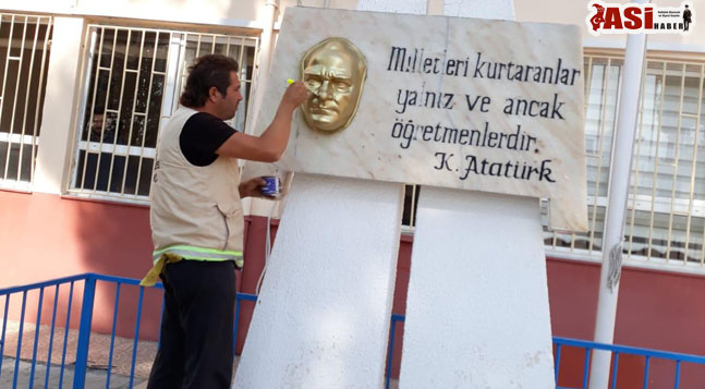 Hatay Büyükşehir Belediyesi Park Bahçe ve Yeşil Alanlar Dairesi Başkanlığı, Dörtyol’daki okullardaki Atatürk büstlerini boyayarak revize çalışmaları gerçekleştirdi.