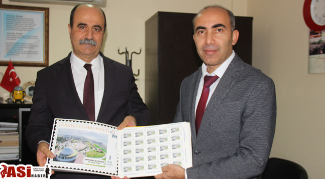 Samandağ PTT Müdürü Ali Ekber Göktaş, özel pulun büyütülmüş çerçeveli fotoğrafını Samandağ Belediye Başkanı Mithat Nehir’e hediye etti.