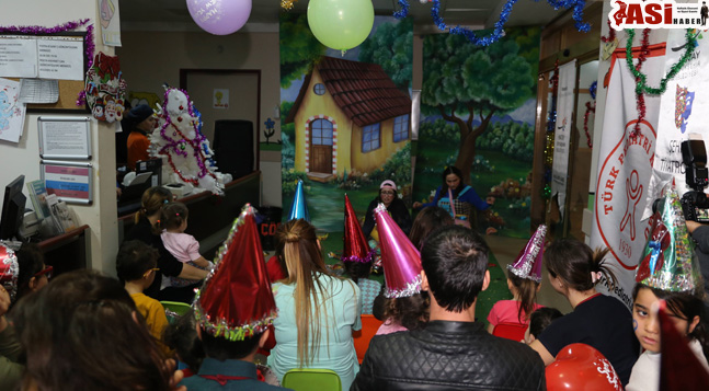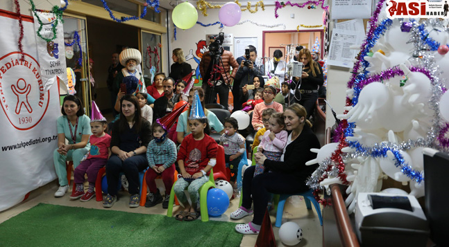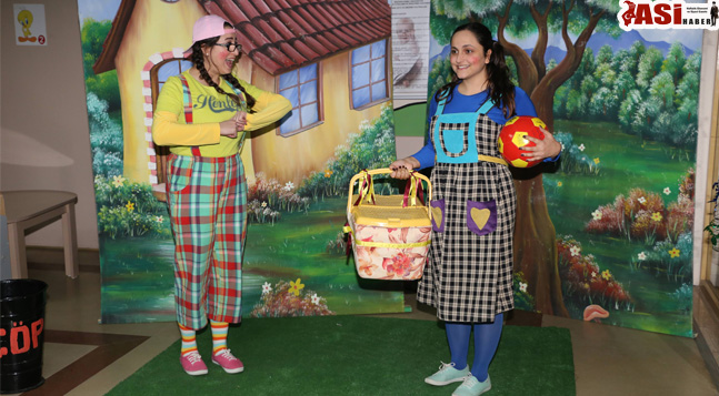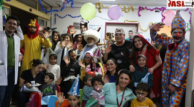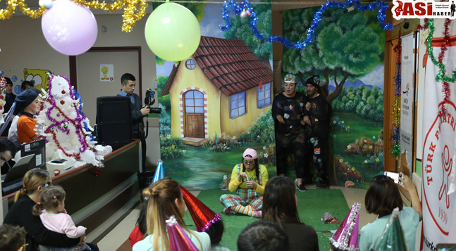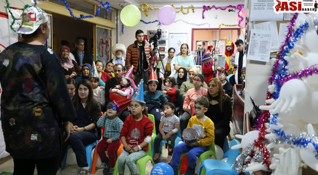 Tedavileri devam eden çocuklara moral sağlayan tiyatro ekibinin etkinliği renkli görüntülere sahne oldu. Tiyatro ekibinin gösterilerini keyifle izleyen çocuklar onlarla fotoğraf çektirerek bu anları ölümsüzleştirdi.