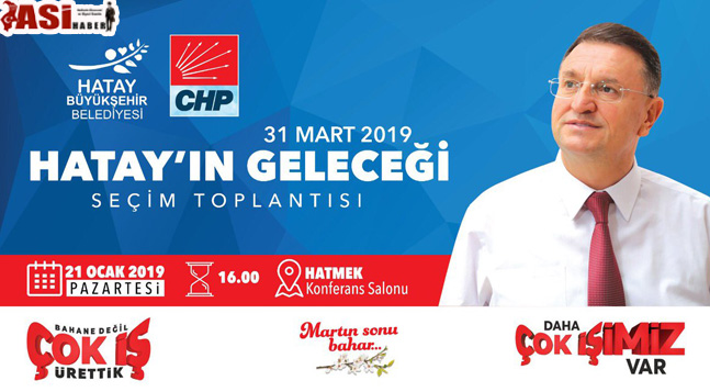 31 Mart 2019 yerel seçimlerinde Cumhuriyet Halk Partisi’nden yeniden büyükşehir belediye başkan adayı olan Hatay Büyükşehir Belediye Başkanı Doç. Dr. Lütfü Savaş, 21 Ocak Pazartesi günü saat 16.00’da HATMEK Konferans Salonu’nda ’31 Mart 2019 Hatay’ın Geleceği’ adlı seçim toplantısında hemşehrileri ile buluşacak.