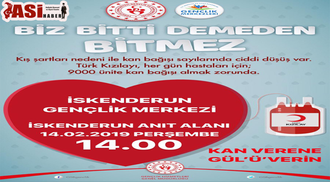 “ Bizler Gençlik Merkezi olarak gençlerimizin her zaman vatanları zor durumda olduğunda elini taşın altına koymasını bilen ve bunun için harekete geçen bir gençlik olduğunu biliyoruz. Bu nedenle kış mevsiminde düşüş yaşanan kan bağışlarındaki kan ihtiyacını gidermek adına İskenderun Gençliğini Kan bağışına davet ediyoruz. 14 Şubat sebebi ile kan veren gençlerimize gül dağıtarak da gülümsetmeyi hedefliyoruz. Daha önce Bayırbucak Türklerine yaptığımız yardımlarda ve Zeytindalı Harekatında “Afrin Yolunda Bir Bayrak” projemizde binlerce bayrak toplamak için koşturan gençlerimizin, bu kez de kan bağışlamak için gereğini yapmaktan geri durmayacağından eminim. Bunun için İskenderun ve çevre ilçelerdeki tüm gençlerimizi 14 Şubat Perşembe saat 14.00’te Türk Gençliğine yakışır bir şekilde kan bağışı yapmaya davet ediyoruz.”Şeklinde konuştu.