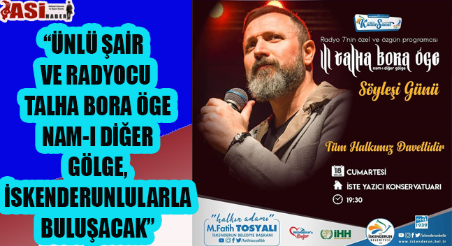 İskenderun Belediyesi kültür ve sanat etkinlikleri çerçevesinde düzenlenecek ‘Şiir ve Söyleşi’ programında, ünlü şair ve radyocu Talha Bora Öge konuk olacak.